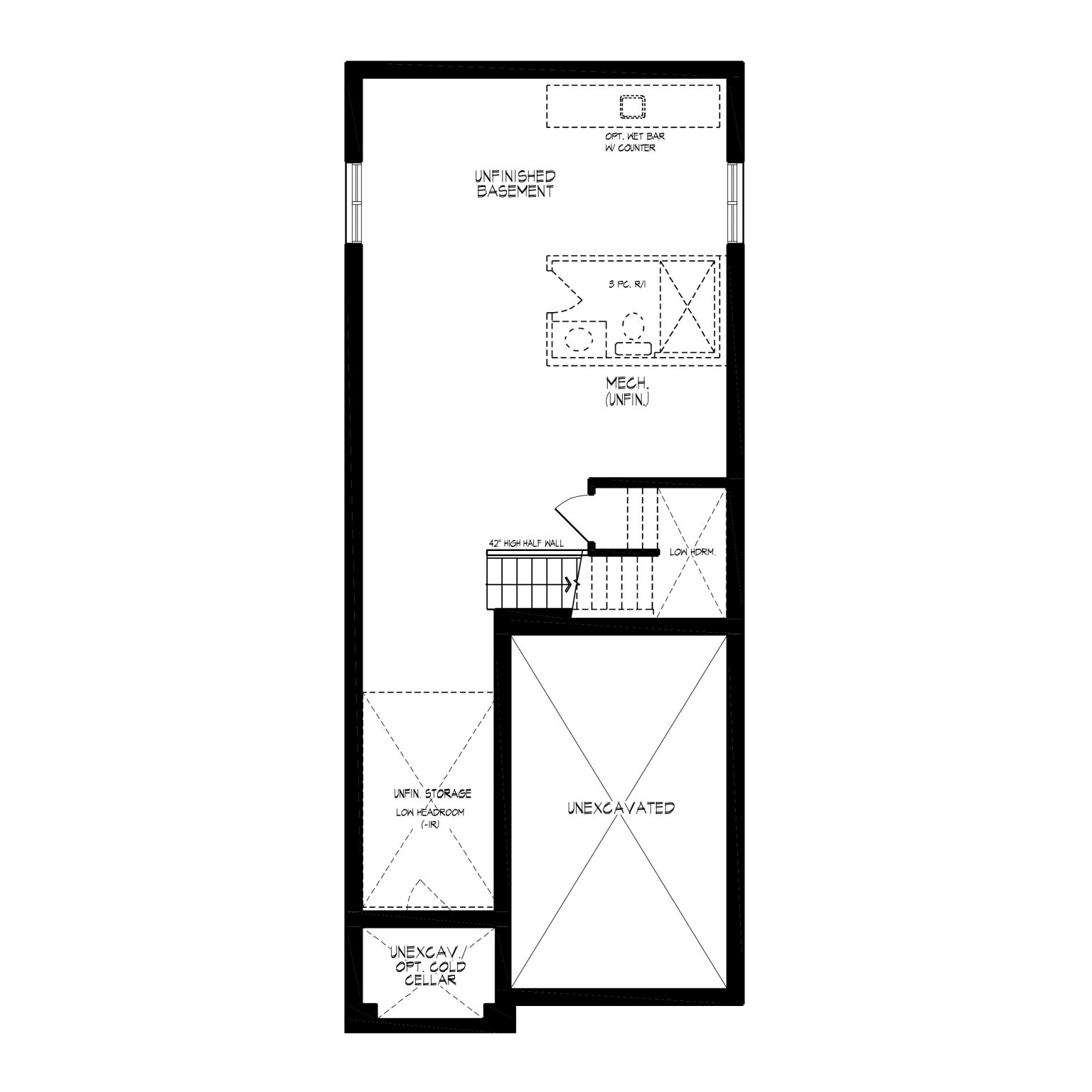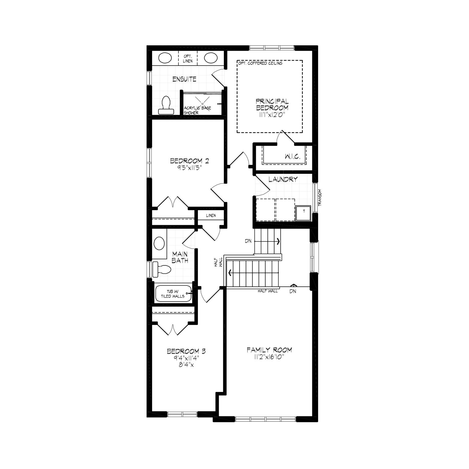 The Harrison’s main floor features a spacious great room with an option to add a cozy fireplace, an open-concept kitchen with a large island and pantry, and a sunken foyer, along with a convenient powder room. The second floor includes a principal bedroom with a walk-in closet and ensuite, two additional bedrooms, a family room that can be converted into a fourth bedroom, a main bathroom, and a laundry room. The basement offers unfinished space with rough-ins for a bathroom, perfect for a future secondary suite.